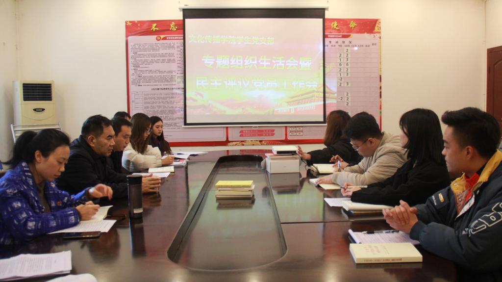 12月12日下午,按照学校党委工作安排,文化传播学院学生党支部召开专题组织生活会暨民主评议党员工作会。文传学院党总支副书记舒畅,学生党支部书记毛浩杰以及学生支部全体党员和预备党员参加会议。校党委副书记王泗德出席会议并作点评讲话。