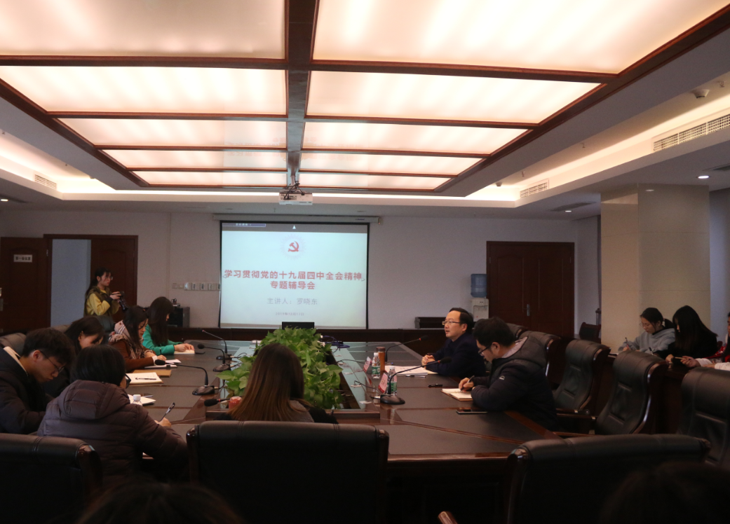 为深入学习习近平新时代中国特色社会主义思想,全面宣传贯彻党的十九届四中全会精神,进一步推进“不忘初心,牢记使命”主题教育活动,12月17日下午,院长、党委副书记罗晓东深入联系部门及教学单位,以“学习贯彻党的十九届四中全会精神,推进国家治理体系和治理能力现代化”为主题在党员和师生群众中开展专题辅导。